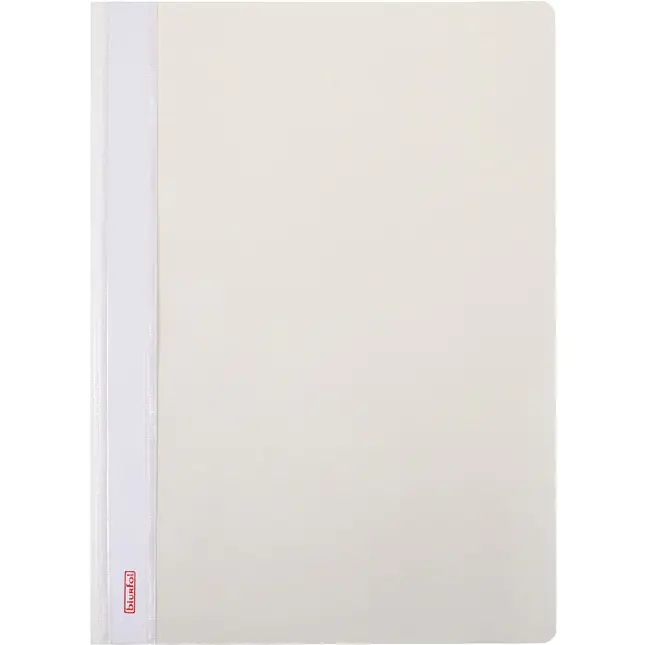 PVC film, soft transparent front, colored hard back; in the middle of the plaque and mustache with a length of 16.5 cm, allowing to attach documents up to 2 cm; replaceable paper strip for description; two notches for easy pulling out of the strap; rounded corners of both covers;