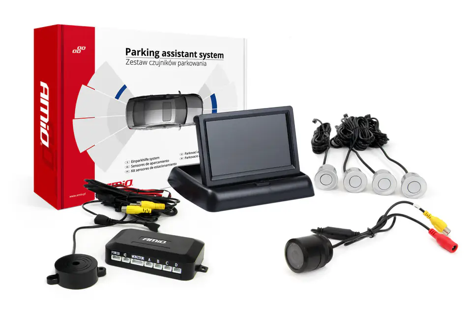 Parking assistant complete set of sensors + camera with display. The set includes: display, sensors, camera, central unit, complete wiring The camera and sensors are activated automatically when reverse gear is engaged. The parking sensor is an irreplaceable help both when driving and while parking. Rear sensors make it easier to park even with a large car, and entering the reversing camera allows us to accurately observe the zone behind the vehicle. The sensor has a built-in video mixer, so it can display the image from the connected reversing camera and a digitally generated distance indicator. The device is particularly useful in crowded parking lots, during rain or snow and with limited visibility, e.g. at night. By determining the distance and direction from the obstacle, we can avoid unnecessary expenses and many unpleasantness caused by the smallest abrasions of the bumper. The set includes: 4-sensor LCD control unit, 4 silver detectors, very efficient speaker, CAM-301 IR reversing camera 28mm 4.3-inch TFT display. hole saw for drilling holes in the bumper. The CAM-301 IR 28mm reversing camera is a modern camera with ? Night vision? - additional IR LEDs provide illumination. The 4.3 inch high resolution TFT display perfectly shows the image of the space directly behind the vehicle. A parking sensor is a device that assists the parking and reversing of a car. It works on the principle of sonar - it emits ultrasonic waves, which, after bouncing off an obstacle, allow you to determine what distance separates the car from the obstacle. When reversing, the device correctly recognizes obstacles in the vehicle's path and warns the driver by sounding (appropriate for the distance from the obstacle) or via the LED display. Full Specification: Resolution 480 x 234 Camera CAM-301 IR 28mm Modern Camera with ? Night vision?- additional IR LEDs provide additional illumination Audible alarm Operating range/sensitivity: 0-2,5m Power supply: 12V Operating frequency: 40KHz Operating temperature: -30C +70C Mounting diameter 28mm