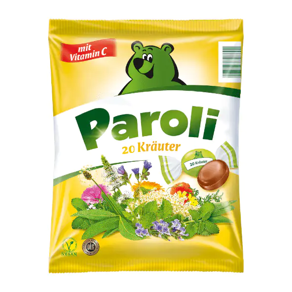 Paroli 20 Kräuter with a harmonious content of a composition of 20 herbs, e.g.: elderberry, thyme, marshmallow root, sage, etc., with vitamin C