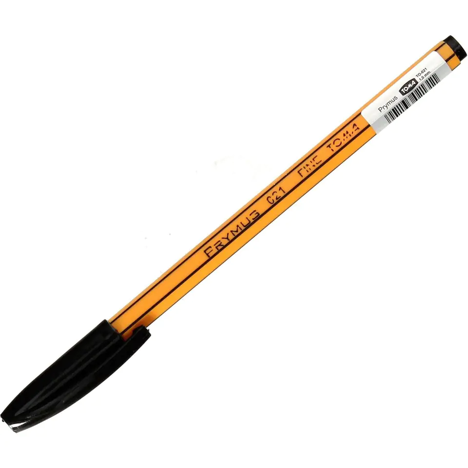 Disposable pen in orange hexagonal case, ventilated ink color cap, durable 0.7mm carbide ball.