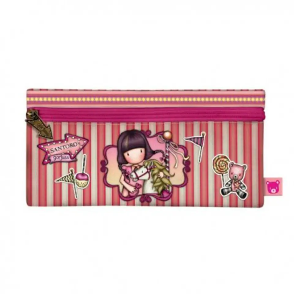 Pencil case - Gorjuss - Carousel The fantastic Carousel series is decorated with a Gorjuss girl with a cute horse kept in sweet pink colors. On the back fireworks, colorful garlands, cotton candy - everything that we find in a cheerful amusement park. Stylish pencil case, sachet that fits all accessories. The interior is lined with a delicate lining with the Santoro logo. It is both pretty and practical. An arrow-shaped pendant next to the slider. Clean with a damp cloth. Dimensions: 22 cm x 11 cm x 1.5 cm. A fun Fairground collection full of backpacks, accessories and stationery, which refers to the mysterious adventures experienced in the Amusement Park. There is no shortage of fireworks, carousels, barrels of laughter, swings and prizes won. Funny pompons, cute patterns or metal pendants will take us to the colorful world of Santoro, full of surprises. This is a collection that we will treasure for many years. Follow the girls, the heroines of series 4: Up & Away, Fireworks, Carusel and First Prize and discover an exciting collection full of wonderful treats! 1129GJ01