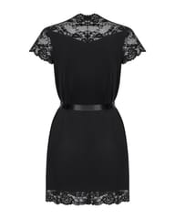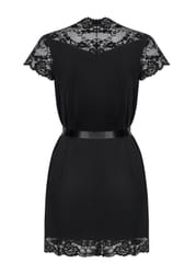 Black peignoir ideal for morning coffee. Cut with short sleeves made of transparent lace. Edges also with a beautiful, lace hem. At the waist ribbon tied with a satin bow. Composition: 85% polyamide, 15% elastane.