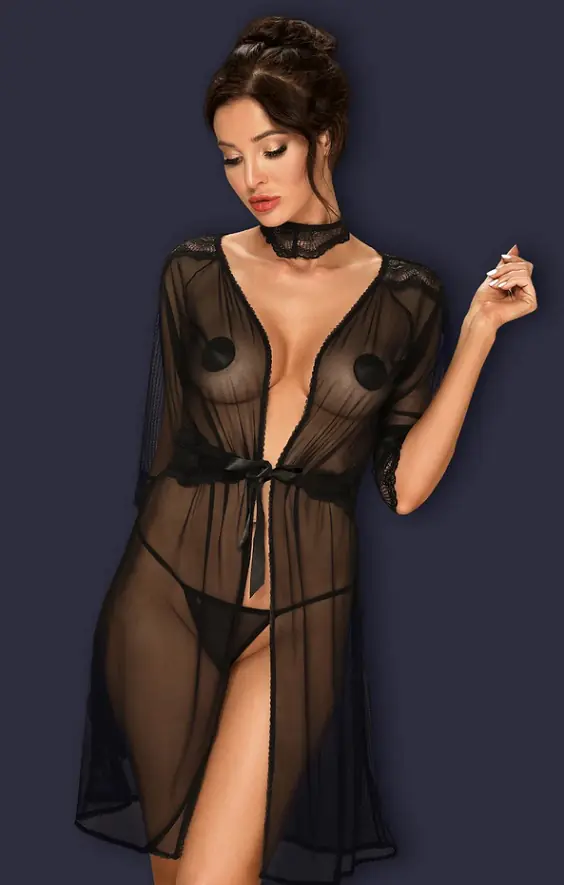Sensual, translucent peignoir made of elastic mesh with a lace tied strap. The shoulders and sleeves are decorated with openwork lace. Choker with comfortable clasp included. The set includes a peignoir, choker and belt. Composition: 90% polyamide, 10% elastane.