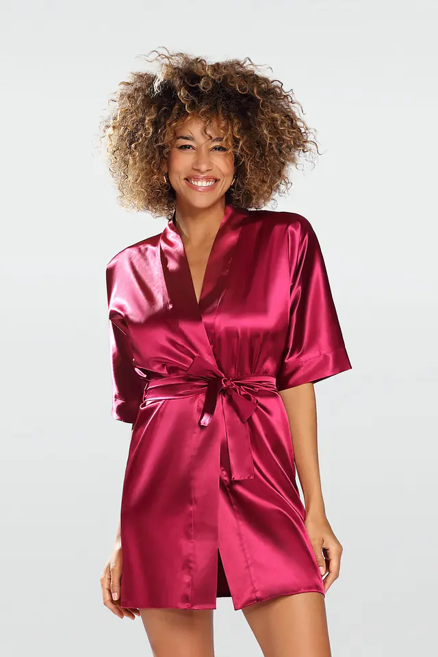 Ekskluzywny peniuar - szlafroczek, wiązany w talii. Gładki, elegancki, kobiecy. Rękawy typu kimono, do okolic łokci. Warto go mieć. Skład: 100% poliester.