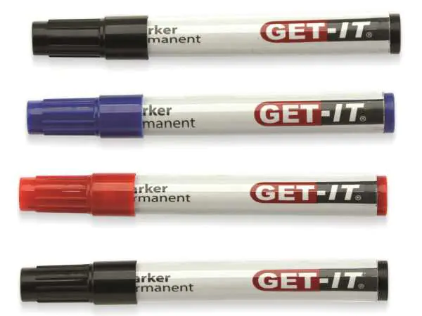 Set of permanent markers, 4 pieces A set consisting of one blue, two black and one red marker with a round tip. Quick-drying, durable and waterproof. Ideal for labeling film, plastic, paper, etc.