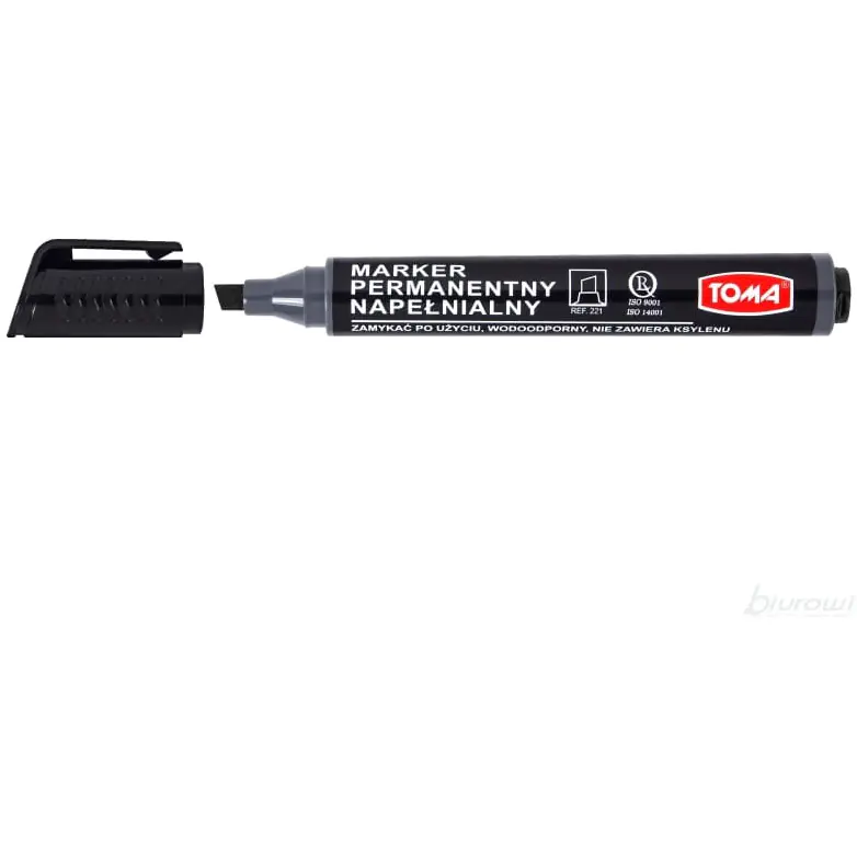 Permanent marker fillable with waterproof ink, free of xylene and toluene. For writing on all surfaces. ISO 9001, ISO 14001 certificates. Japanese technology and production. Very easy to open. A few drops of ink are enough to refill.