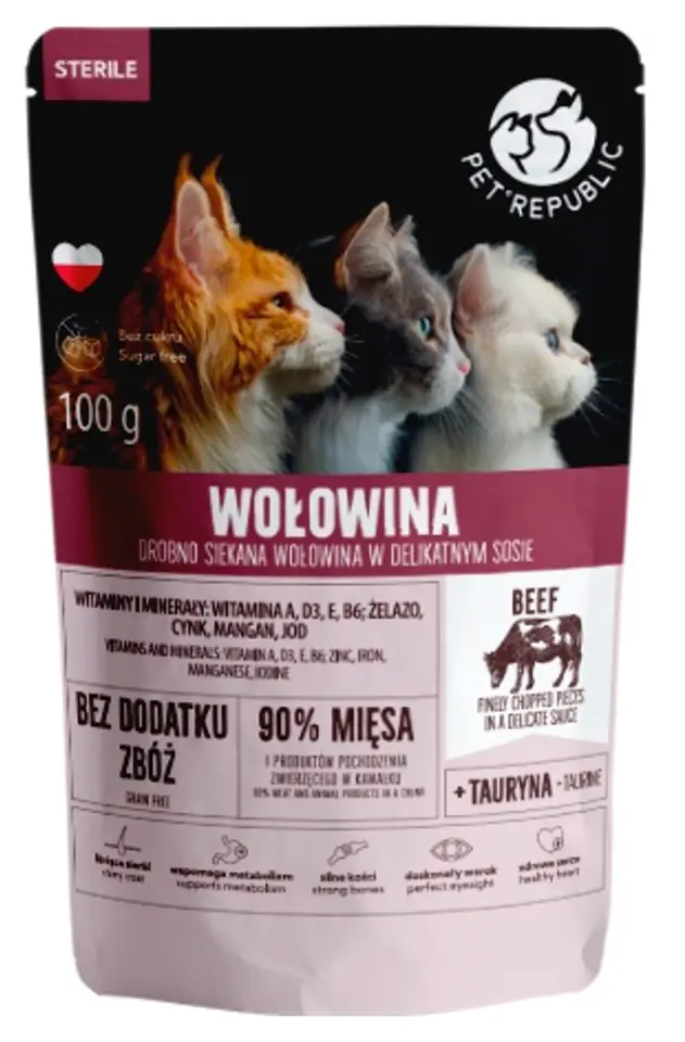 Finely chopped pieces of beef for cats of all breeds, served in a delicate sauce that invites you to a delicious meal. 90% meat and animal products in a piece!