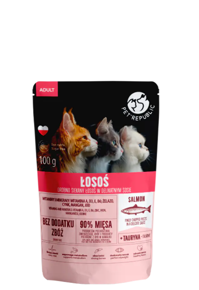 Finely chopped pieces of salmon for cats of all breeds, served in a delicate sauce that invites you to a delicious meal. 90% meat and animal products in a piece!