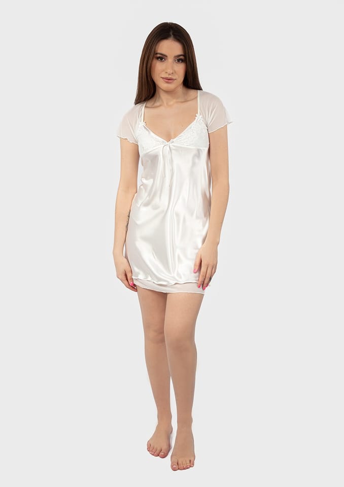 KOSZULKA Z KRÓTKIM RĘKAWEM USZYTA Z SATYNY MISECZKI PROFILOWANE Z HAFTOWANEJ KORONKI PODSZYTEJ SATYNĄ NA PRZODZIE OZDOBNA KOKARDKA RĘKAWY TIULOWE DÓŁ OZDOBIONY TIULOWĄ FALBANKĄ