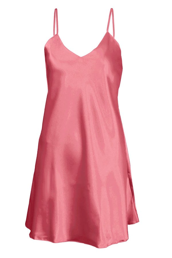 GŁADKA HALKA USZYTA ZE ZWIEWNEJ SATYNY. PRZÓD HALKI TWORZY DELIKATNY TRÓJKĄTNY DEKOLT. RAMIĄCZKA SĄ CIENKIE I REGULOWANE.