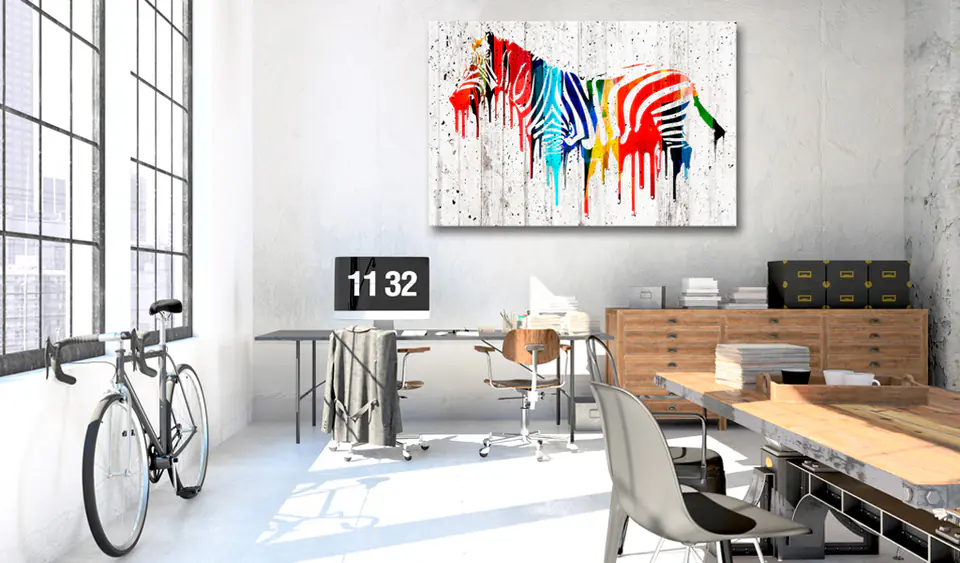 Image "Picture - Colorful zebra" is printed on a special fleece canvas that perfectly reproduces colors. The canvas is stretched on a light but stable frame made of environmentally friendly materials. High-end decoration is provided by high-quality printing, thanks to which colors are expressive and details are perfectly reproduced, regardless of the image format.