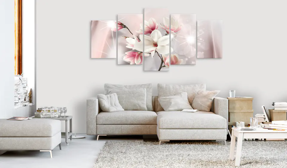 Image "Painting - Dazzling Magnolias (5-piece) wide" is printed on a special non-woven canvas perfectly reproducing colors. The canvas is stretched on a light but stable frame made of environmentally friendly materials. High-end decoration is provided by high-quality printing, thanks to which colors are expressive and details are perfectly reproduced, regardless of the image format.
