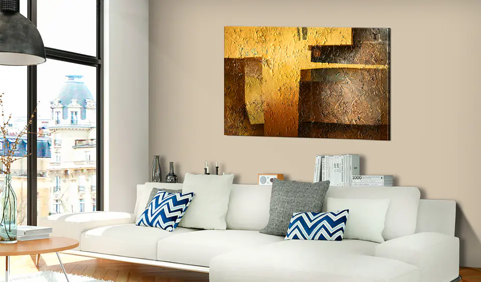 Image "Picture - Golden Modernity" is printed on a special non-woven canvas perfectly reproducing colors. The canvas is stretched on a light but stable frame made of environmentally friendly materials. High-end decoration is provided by high-quality printing, thanks to which colors are expressive and details are perfectly reproduced, regardless of the image format.