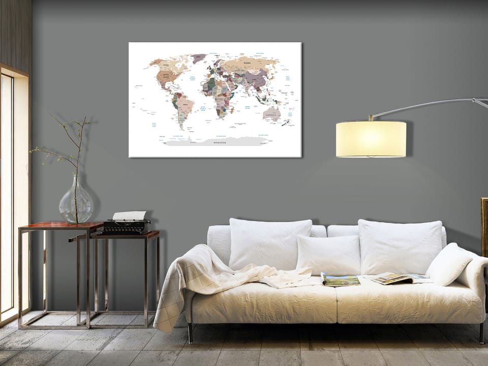 Picture on a traffic jam "Painting on a traffic jam - Where to today? [Cork map]" is much lighter than traditional wall decorations. Thanks to this, decorative cork boards can hang anywhere in your apartment or office. Canvas with a print is applied to the cork plate. Thanks to this, the print is characterized by expressive colors and reflects the smallest details. Pin pins or notes to it and create your own individual pattern on your wall!