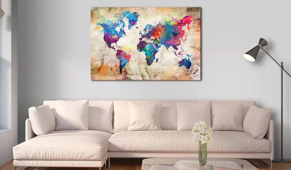 Picture on a traffic jam "Painting on a cork - World Map: Urban style [Cork map]" is much lighter than traditional wall decorations. Thanks to this, decorative cork boards can hang anywhere in your apartment or office. Canvas with a print is applied to the cork plate. Thanks to this, the print is characterized by expressive colors and reflects the smallest details. Pin pins or notes to it and create your own individual pattern on your wall!