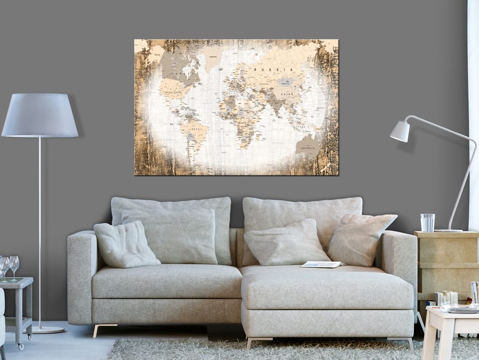 Picture on a traffic jam "Painting on a cork - Enclave of the world [Cork map]" is a product for people looking for original decorations for the wall. Eco-friendly material and interesting pattern make an ordinary cork board turn into a stylish accessory that you can use in a variety of ways. You can pin pins to images on the cork, mark places you've visited on the map, or attach notes.