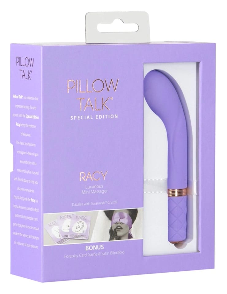 Special Edition: Vibrator Racy incl. a card game & a satin scarf!The Special Edition Racy from Pillow Talk is extremely seductive. An exciting couple's card game with foreplay inspiration and a high-quality satin scarf come with the popular G-spot mini vibrator Racy. The scarf can be used as a blindfold or as restraints for captivating moments.The stylish vibrator is perfect for a bit of ecstasy in between times and on the go because it can fit inside any handbag thanks to its handy size. The vibrator pleasures the vagina intensely with its stimulating raised grooves on the shaft. Its wonderfully curved head can be used to provide spot-on G-spot pleasure. The velvety soft touch surface means that the vibrator slides in almost on its own. The powerful power bullet motor provides deep, shaking vibrations for exciting stimulation. The vibrations can be controlled gradually and precisely at the push of a button. The control button sparkles thanks to its beautiful Swarovski® stone! Other highlights are the Press & Hold function that increases the power, the Quick-Off function that turns it off immediately and the practical travel lock. It can be recharged with the included USB cable. Vibrator: Complete length 12.7 cm, Ø 2.2 cm. Silicone. Satin scarf: 100% polyester.