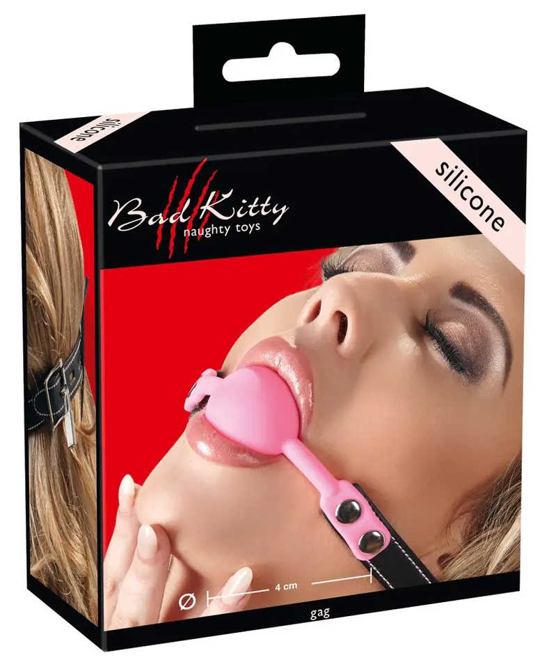 Silicone red gag on black stripes (imitation leather) with 7 holes and buckle. Lock with a small padlock with two keys. Seams in contrast color. Gag diameter approx. 4cm, circumference from 46cm to 56cm.