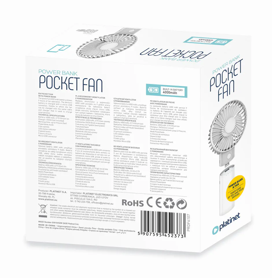 Pocket 10 cm fan with 3 speed levels and power bank functionality.