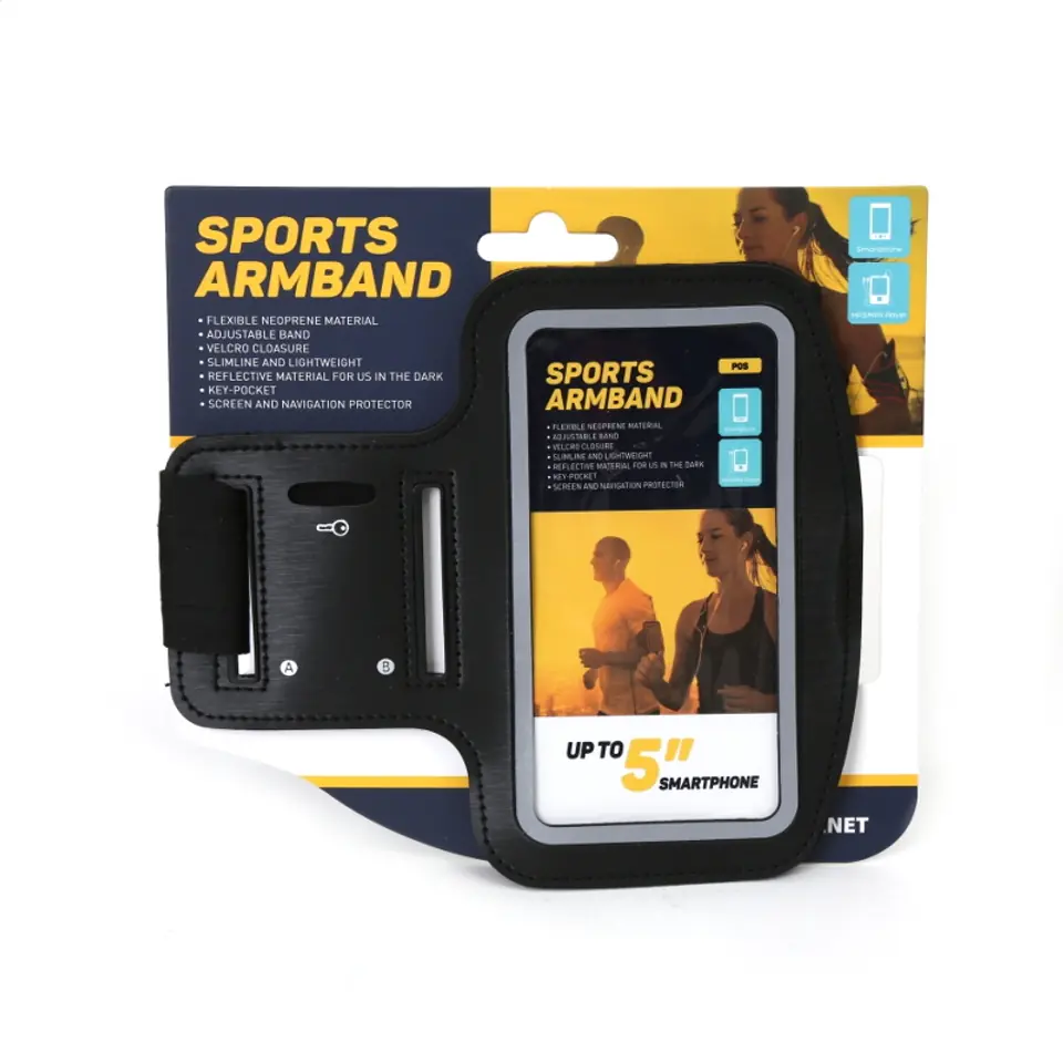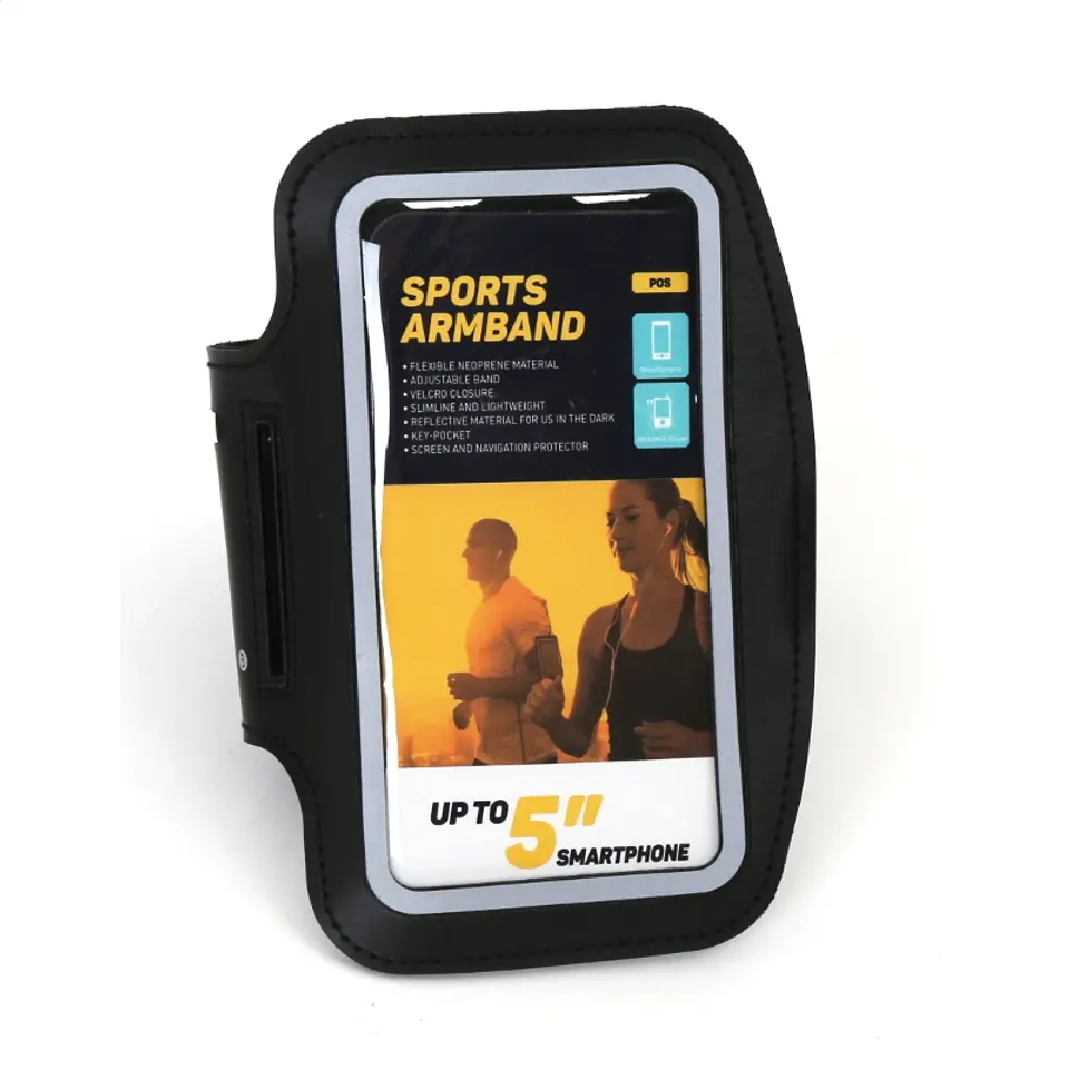 Universal protective sports armband to fit up to 5" smartphone. Good protection for your device during sport activities like running, cycling or walking. Slimline and lightweight product. Velcro closure, flexible neoprene material with adjustable band and wide range of regulations provide the highest comfort. Reflective material is perfect for the dark and night. The cover has a special key-pocket. Available in black, blue, red, green and grey colours. Outside dimensions: 44.5 x 13.7 x 1 cm Colour version: black Fabric: PU