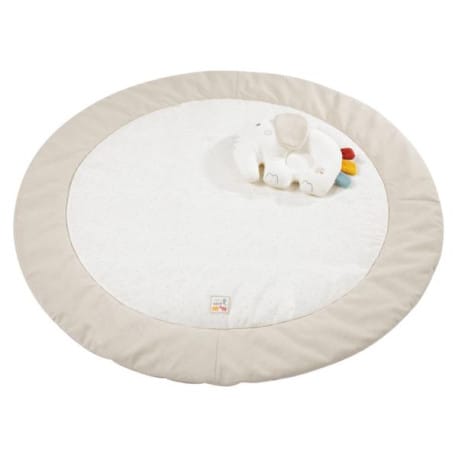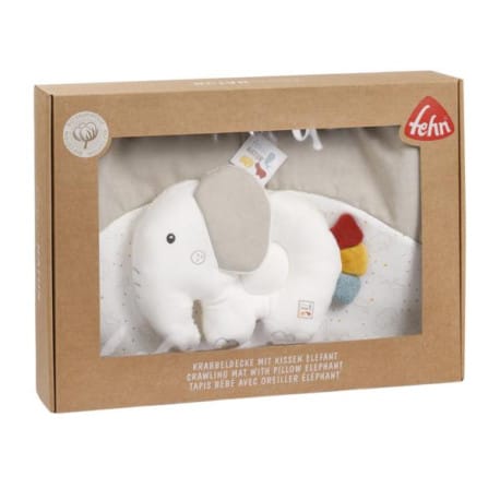 Play mat with pillow, Elephant, from the collection: Nature The Natura collection combines excellent quality of natural materials with unique design, consistently focuses on ecology, The products in this collection use pure, certified organic cotton as the top material, The filling consists of PLA fibers, All materials used in toys are of natural origin, The only plastics used in mascots, are hidden inside and inaccessible to children, Soft mat made of certified organic cotton, can act as a blanket for playing and crawling pads, It is a perfect place to play safely in various phases of the child's growth, A charming pillow, in the shape of an elephant, perfectly adapts to the child's neck and gently supports and relieves the baby's head, Child during play, lying, crawling on the mat, strengthens the muscles of the back and neck, Soft materials ensure the safety and optimal comfort of the child from the very beginning at home and on the go, Encourages play and exercises strengthening muscles, Stimulates and supports cognitive development and motor skills, Ideal for use on the go, Upper material: certified organic cotton, Filling: PLA fibers, polyester, Can be washed at temp, 30°C, Mat size: Ø 95 cm, Pillow size: 29 cm, Package dimensions: 36 cm x 50,5 cm x 11 cm, All toys of the German brand FEHN are safe for children from 0+, They are made of the best quality materials, Meet EN71, CE standards, tested for safety by independent testing institutes, 56150
