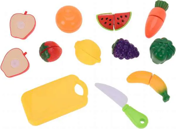 Fruit and vegetables to play set for cutting 19 accessories The slicing set is the perfect fun for the child to get to know the different types of fruits and vegetables. Playing together will certainly result in great moments while cooking delicacies together in the kitchen. All fruits and vegetables are divided into two parts, connected to each other by Velcro, which imitates the process of cutting them. Technical Specs: Dimensions:1 x 18.5 cm, Material: plastic, Set includes: 2 Half apple, 2 Half strawberries, 2 half oranges, 2 Half lemon, 2 Carrot halves, 2 Pepper halves, 2 banana halves, 2 pieces of melon, 1 bunch of grapes, 1 cutting board, 1 knife,