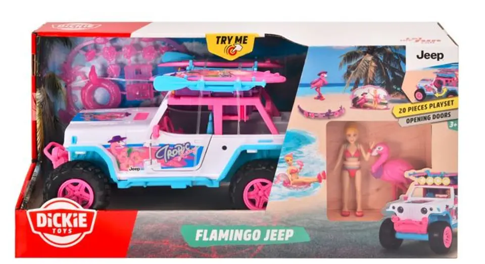 Jeepster Commando with light and sound function. Includes figure, flamingo, bracelet and many accessories. Scale: 1:24. Dimensions: 22 cm, 3l+.