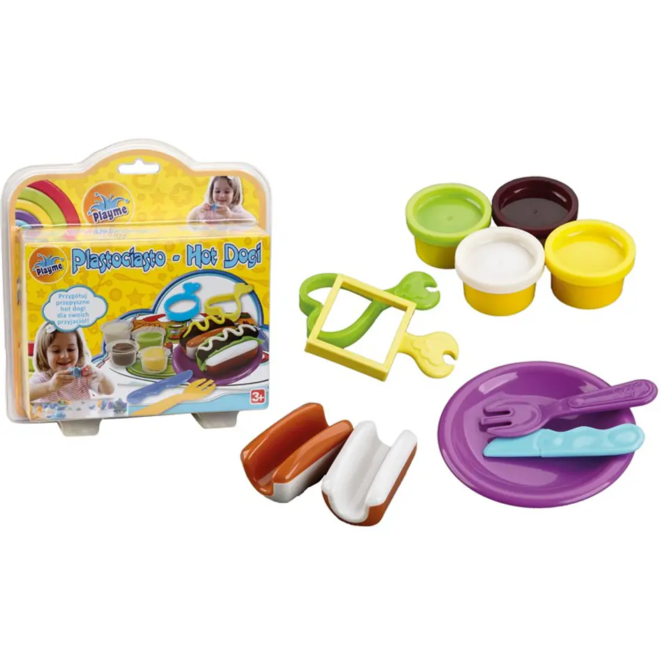 Plastociasto – mini Hot-Dog set from PLAYME. The set includes: 4 plastic containers and additional elements – molds, plate and cutlery. The toy develops the child's creativity and manual skills. The toy is made of high quality, non-toxic materials safe for children.