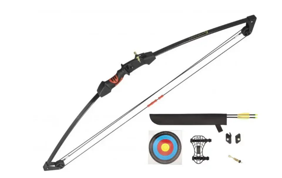 | Set contents: | 2 fiberglass arrows, eco-leather quiver, archery target, finger skin, classic stand, classic sight, forearm protector, spare rubber inserts for the maidan in orange |