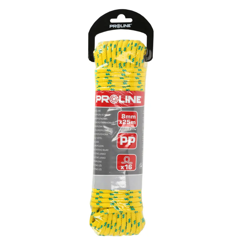 - Rope with a twisted core braided with polypropylene yarn (16 threads) in yellow and green color