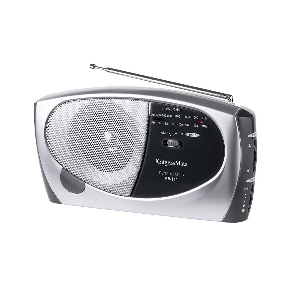 Headphone output (3.5 mm) Foldable handle Telescopic antenna Radio frequency: • AM: 522 – 1620 kHz • FM: 87.5 – 108 MHz Power consumption: 5 W AC power supply: 230 V; 50 Hz DC power supply: 6 V (4x battery C) Dimensions: 256 x 135 x 65 mm