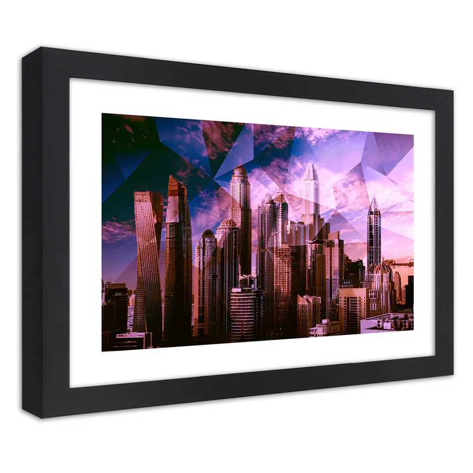 Poster in black frame, Geometric city in purple Size 60x40