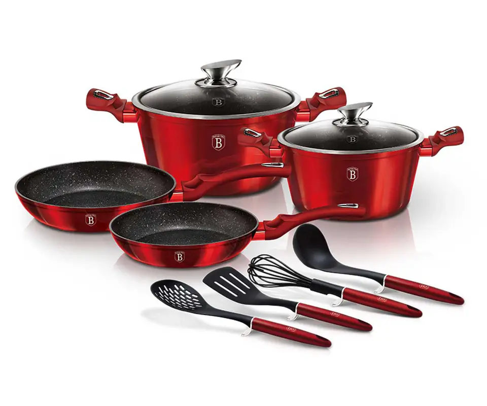 SET OF GRANITE POTS AND PANS BERLINGER HAUS BURGUNDY. Kitchen utensils included.