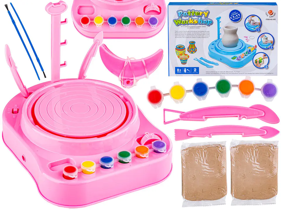 For the sake of the youngest, the Pottery Wheel is made of high quality, certified plastic. Potter's mass, paints and knives are completely safe for children. The toy does not have any sharp edges or elements with which a child could cut himself.