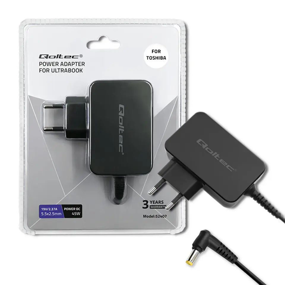 A Solution Dedicated to YouReliability is crucial to you? Choose a Qoltec AC adapter dedicated to Toshiba laptops. It is ideal for use at home or in the office, as a main or auxiliary power supply. It is made of the highest quality materials, and the technologies used in it will allow low power consumption and high efficiency. In the set you will find the power supply along with a velcro cable organizer, which will allow you to adjust the length of the cable to your needs.Safe power supply in a universal designThe power supply will ensure stable operation thanks to the manufacture of the highest quality materials and special protections: