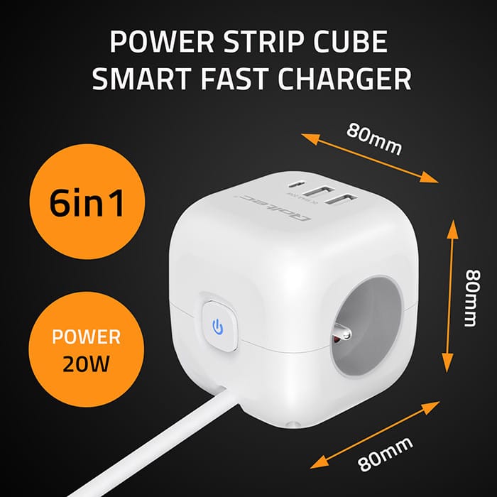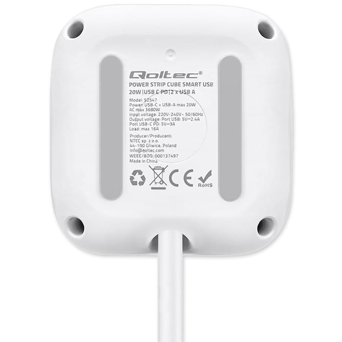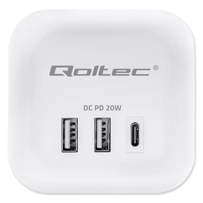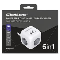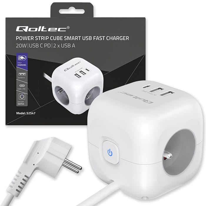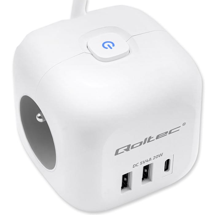 One device, fewer cables, more space and full power convenienceLooking for a practical way to organize your space and power multiple devices from a single, convenient source? Whether you're aiming for a tidy setup under your desk, behind the TV, or on your kitchen counter the Qoltec power cube is the perfect solution to help you stay organized and fully functional. Instead of using multiple extension cords and chargers, all you need is one compact device that delivers safe and stable power to all your essential electronics.Thoughtful port layout - no more interlocking plugs and cable clutterDesigned with comfort in mind, the power cube Offers an ergonomic arrangement of 3 AC outlets on the sides of the case, allowing easy connection of even larger plugs without blocking each other. On the front, you'll find 2 USB-A ports and 1 USB-C PD port, which are always on hand for quick charging of your smartphone, tablet or headphones - Without having to reach for separate chargers. Minimalism, functionality and modern technology - everything you need in one stylish deviceAn illuminated switch with a subtle blue light indicates the power status - with one click you can disconnect the entire cube, which is not only convenient, but also energy efficient. It allows you to easily and quickly disconnect the power supply, and the compact cubic form is not only a designer look, it is above all a practical solution that provides excellent organization of space. Elegant design with your comfort in mind - because even the simplest items can be stylishThis power cube is not only a practical accessory - it is also an aesthetic accessory that will fit perfectly into modern interiors. With its classic white casing and minimalist finish, it looks elegant and subtle. We designed it Based on the latest trends, combining elegance with simplicity of use. Make the simplest everyday objects compose with each other to create harmony.