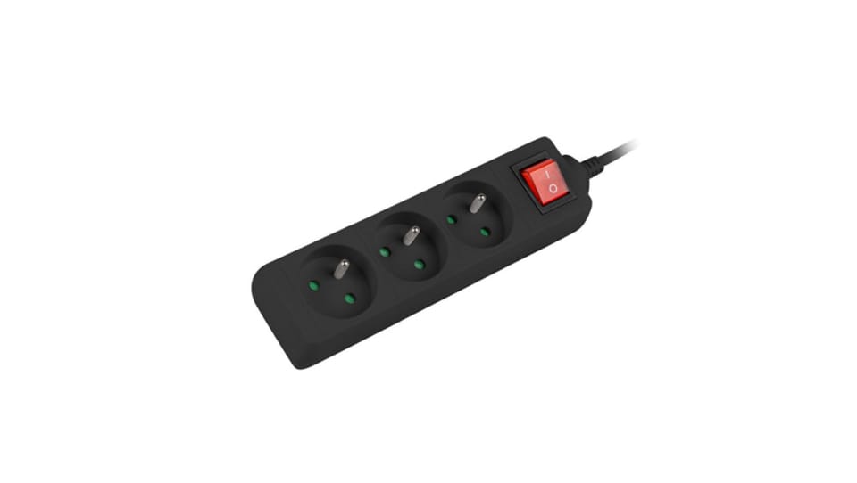 Power strip 1.5m, black, 3 sockets, with switch, cable made of solid copper