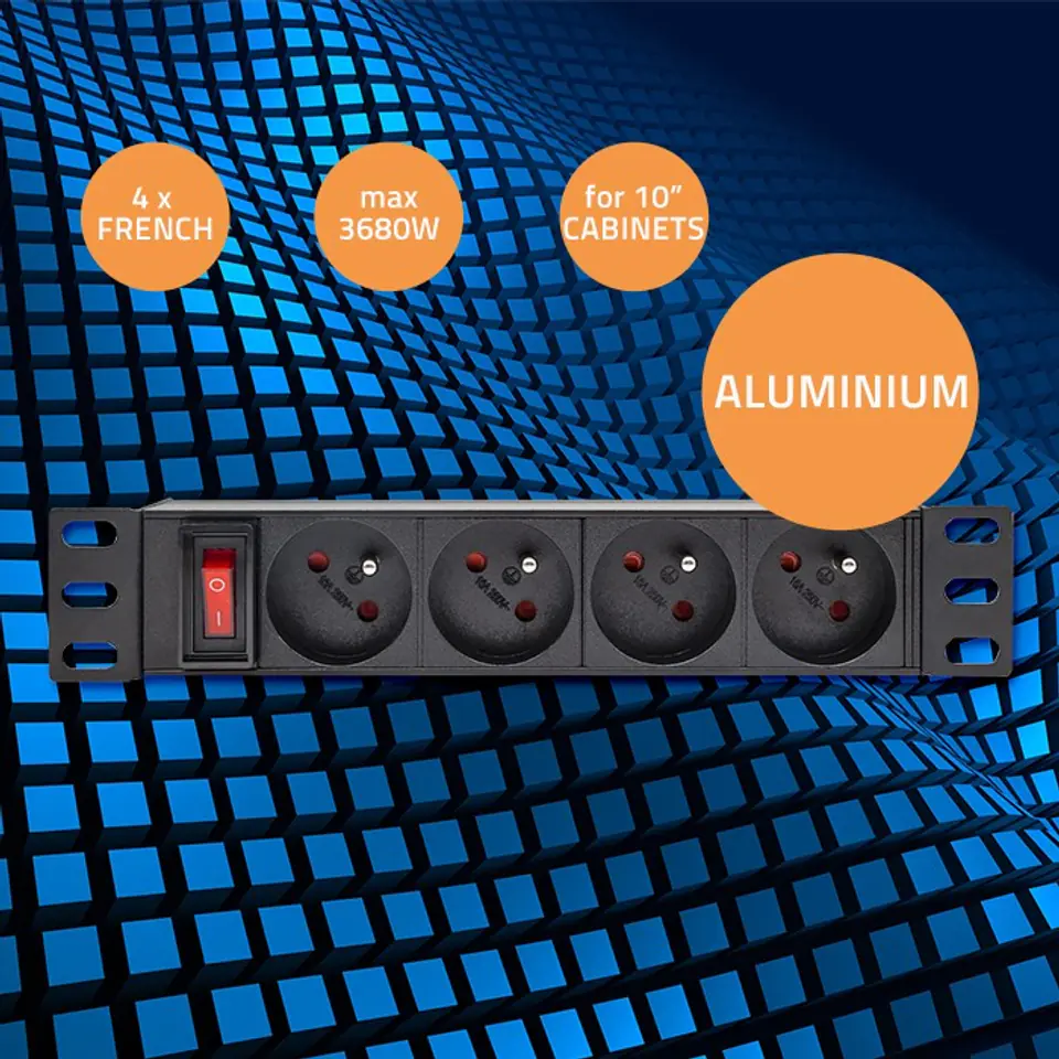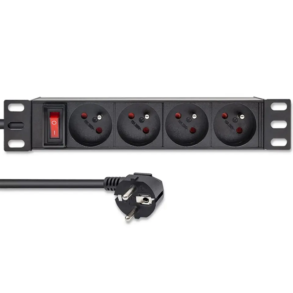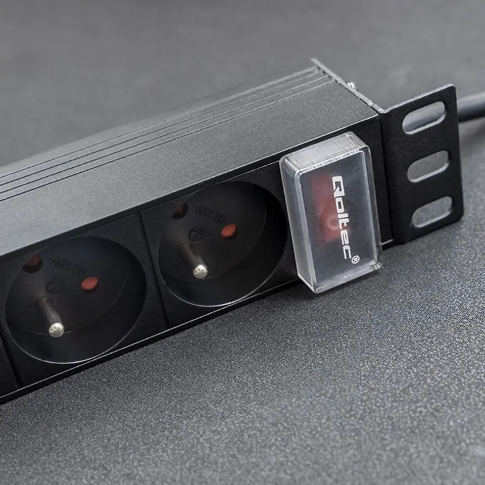 Stable and safe power supply for your devicesDo you run an IT company, perhaps you are involved in energy, industry or operate a small server room at home? Choosing the right equipment should always be very thoughtful, and the most important element in this case is a reliable power supply. The Qoltec PDU power strip is ideal for this. By purchasing our power strip, you ensure the right level of security for all the network devices in your server rack by protecting them from surges and power outages and increase energy efficiency.High quality and durabilityChoosing the right PDU strip, it is worth paying attention to functionality, the quality of the materials from which it is made, the mounting and the facilities offered, such as the illuminated switch, which allows you to quickly locate the power source. Our product fits perfectly into 1U 10" racks. The socket strip has 4 FRENCH sockets. The housing is made of high-quality aluminium in black, while the sockets are made of durable ABS plastic. Thanks to which the socket strip is resistant to mechanical damage and intensive exploitation. Each PDU power strip has special brackets on both sides with which they can be mounted. The sockets are arranged at an angle of 35 degrees to the vertical surface of the server cabinet, making it easier to manage cabling and increasing the space in the server cabinet.Highest safety standardOur surge strips for RACK cabinets meet the highest standards and are CE and RoHS certified. They have also passed tests for:- electrical strength (Hypo test),- earth continuity,- insulation strength.