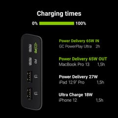 - The GC PowerPlay Ultra has four fast charging ports for a total of 128W, which will allow you to charge your laptop, tablet and smartphones simultaneously - and at top speed! The power bank itself will charge just as quickly, in just 2 hours