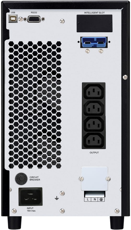Zasilacz awaryjny o mocy 2400 W oraz mocy pozornej 3000 VA. Zasilacz posiada cztery porty IEC C13 i port C20.