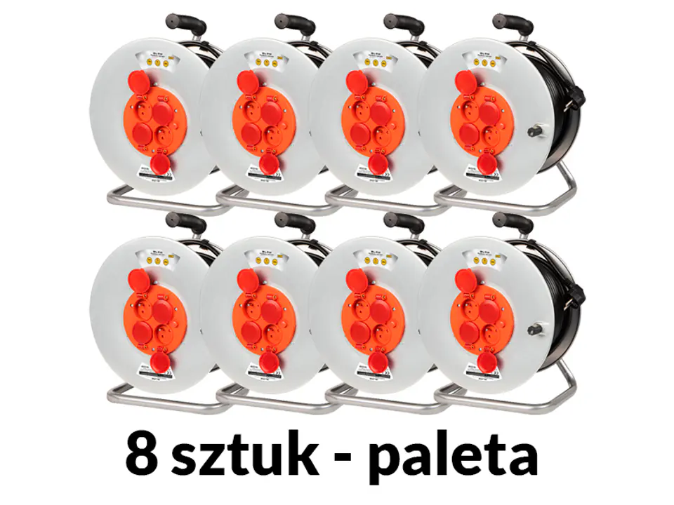 8 pieces of solid extension cords with metal drum brand BLOW. Extremely useful and irreplaceable when we want to connect electrical devices, e.g. a lawn mower, drill, car vacuum cleaner or garden lamp.