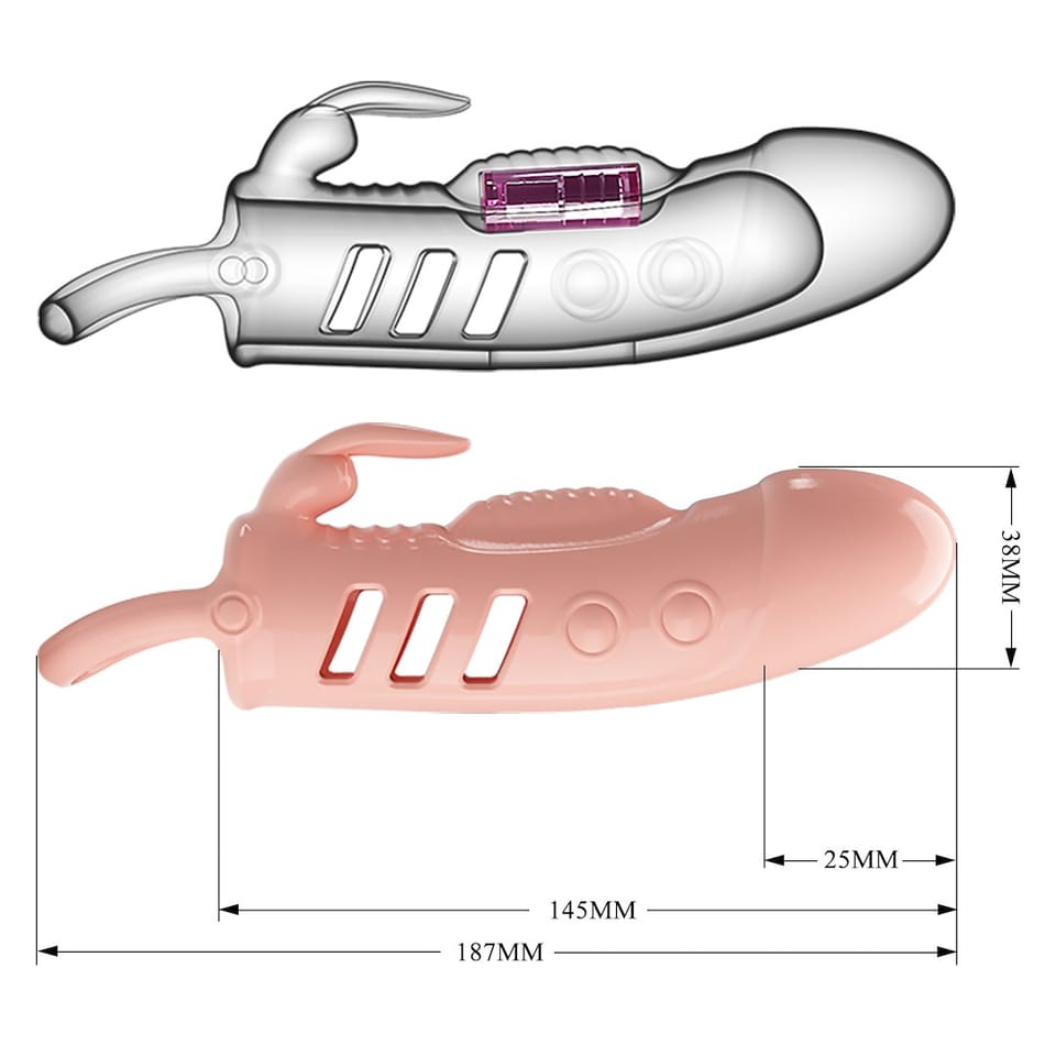 Have serious sexy fun with this vibrating rabbit overlay. This erection-enhancing and pleasurable penis overlay is made of smooth TPR and is held by a testicular loop. The vibrator at the tip lengthens the penis and activates on contact. By stimulating the head of your shaft, it also provides it with internal stimulation. Take her to climatic bliss by turning on the rabbit to deliver vibrations directly to her clitoris. The elastic cap wraps around your penis, providing a stronger, more lasting erection – giving you more time to enjoy the vibrations!