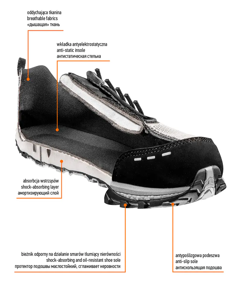 NEO work shoes are the basic protection during work. Upper made of breathable material. Non-slip sole made of EVA foam coated with rubber provides high comfort and effective shock absorption, guarantees safety and convenience. Thanks to the soft finish inside the shoe, the comfort of work remains at a high level.