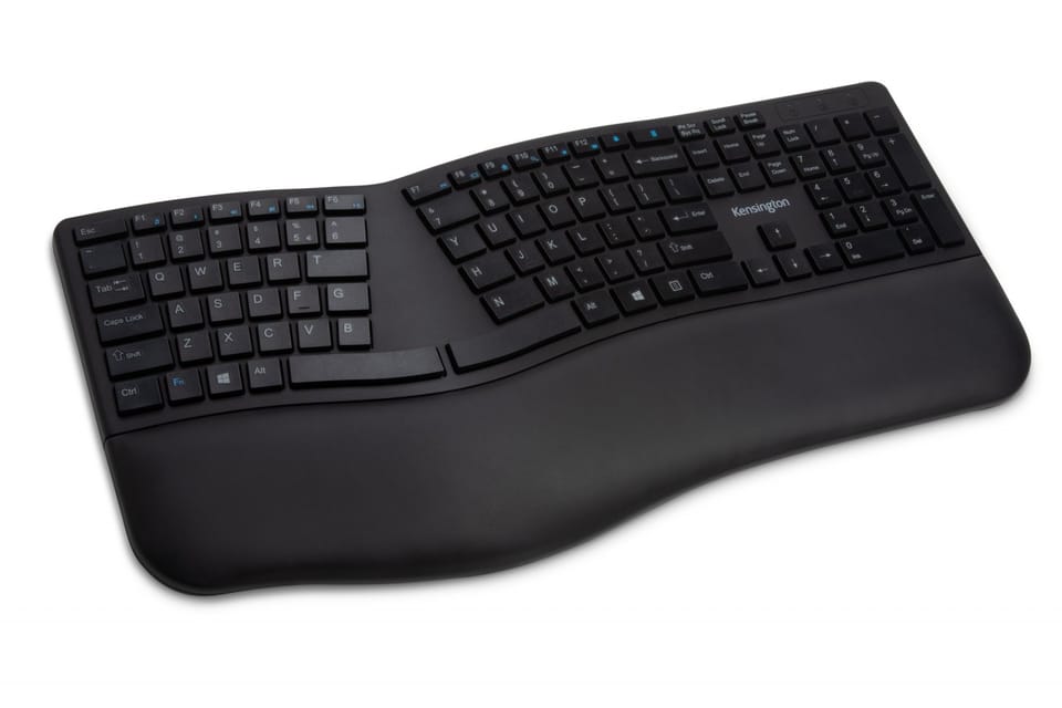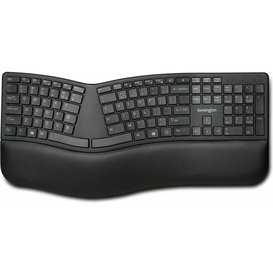 Ergonomically designed, the Pro Fit Ergo wireless keyboard features a split, angled surface with adjustable tilt and a built-in wrist rest to ensure a comfortable posture for your hands while working on your computer. In addition, it has 2 wireless options (2.4GHz and Bluetooth 4.0 LE) with 128-bit AES encryption, spill-proof silent keys, F-keys for shortcuts, Caps Lock, Numbers Lock , Scroll Lock, three power-saving modes and a replaceable receiver*.