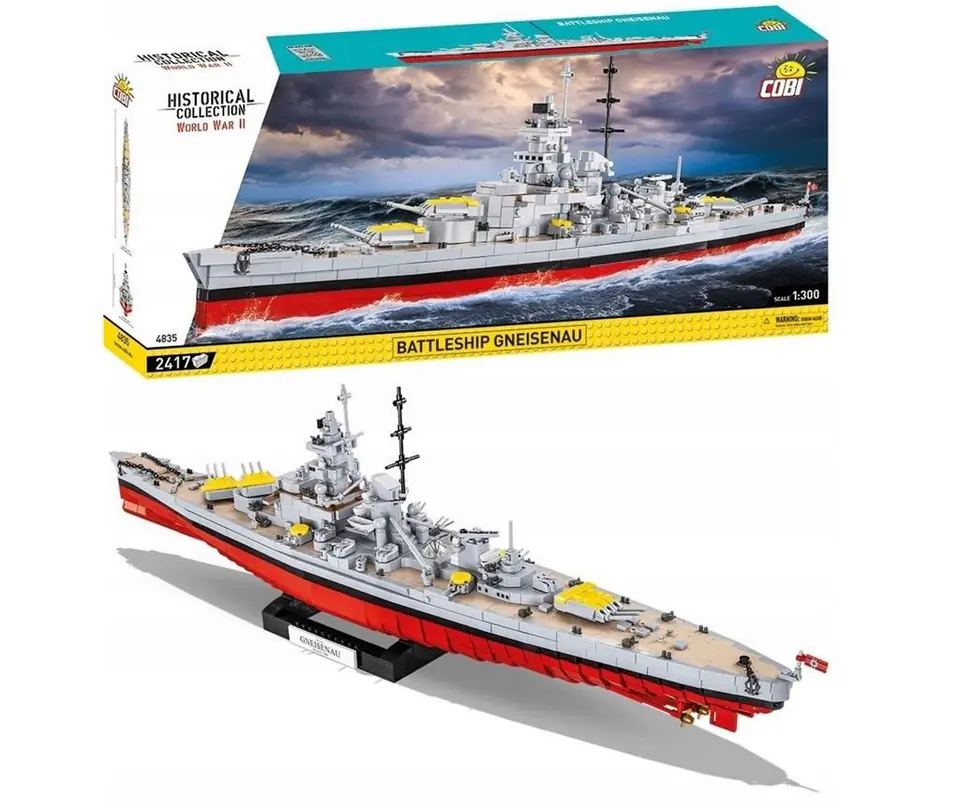The collector's model of the German battleship Gneisenau from World War II has been prepared by COBI in a model scale of 1:300. It consists of 2417 building blocks and is as long as 81 cm. It faithfully reproduces the proportions of the historical ship and retains all its essential elements, including armament. The ship has been reproduced as it stood during Operation Berlin 1941 (Atlantic). This was the famous corsair raid in the Atlantic Ocean, in which the battleships Scharnhorst and Gneisenau took part!