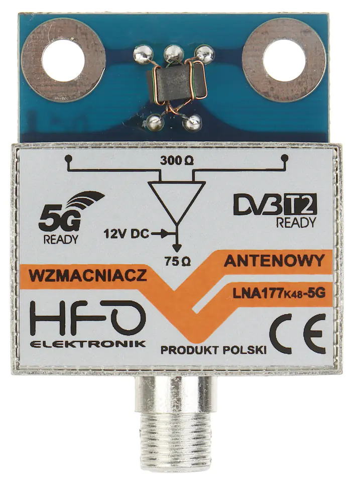 | 75 Ohm (gniazdo typu F służy też do zsilania wzmacniacza) | Impedancja wyjściowa: |