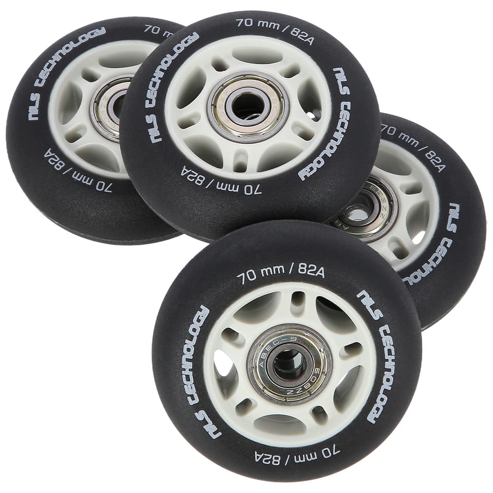 PU BLACK MATT NILS EXTREME wheels are made of polyurethane. The most important parameters of the wheels are hardness and diameter. The hardness of the wheels determines both driving comfort and adhesion to the ground. PU-82A wheels provide good cushioning and excellent adaptation to any surface. The diameter of the wheels has a direct impact on the speed of travel. Larger diameter wheels allow you to achieve higher speeds, but they do not guarantee as much maneuverability as wheels with a smaller diameter. ABEC 9 bearing, made of high quality carbon steel, which provides excellent hardness and strength. It is characterized by the lowest rolling resistance, which translates into the highest speed in the American Standard Annular Bearing Engineering Committee or ABEC for short. An important parameter of this bearing is eccentricity, i.e. roundness on the track in the inner ring and amounts to only 0.0012mm. Specification: Wheel hardness: 82A Size: PU 70x24 mm/82A Package quantity: 4 pack Bearing class: ABEC 9 Number of bearings in the package: 8 Number of spacers: 4 Notes: Not intended for commercial use Warranty 24 months