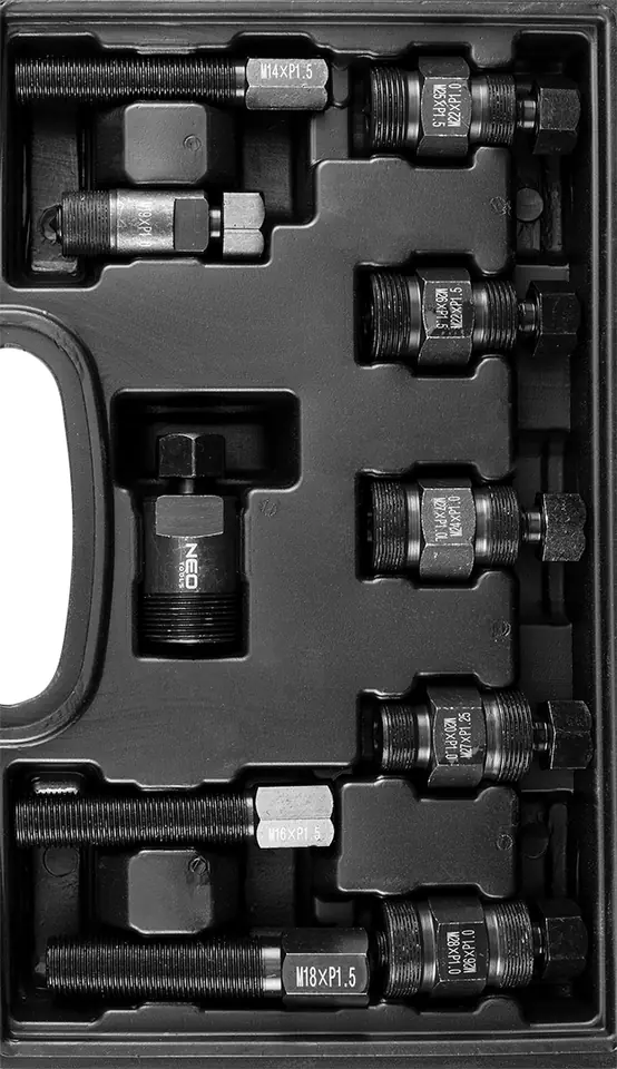 Flywheel pullers, set of 10, used to separate the flywheel from the crankshaft cone, fits most motorcycle brands, right threads: M14 x P1.5 - R, M16 x P1.5 - R, M18 x P1.5 - R, M19 x P1.0 - R, M20 x P1.0 - R, M22 x P1.0 - R, M22 x P1.5 - R, M24 x P1.0 - R, M25 x P1,5 - R, M26 x P1.0 - R, M26 x P1,5 - R, M28 x P1.0 - R, M27 x P1.25 - R, M28 x P1,5 - R, left thread: M27 x P1.0 - L;