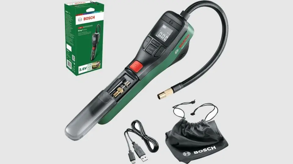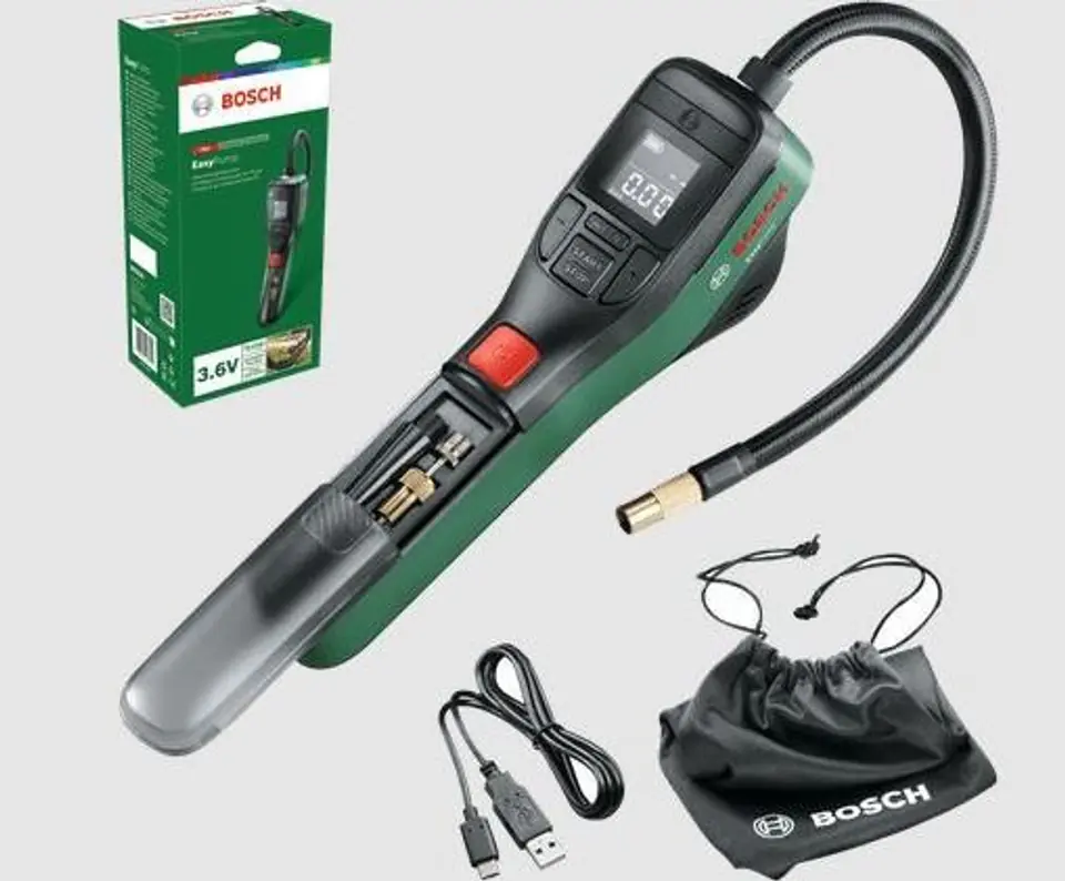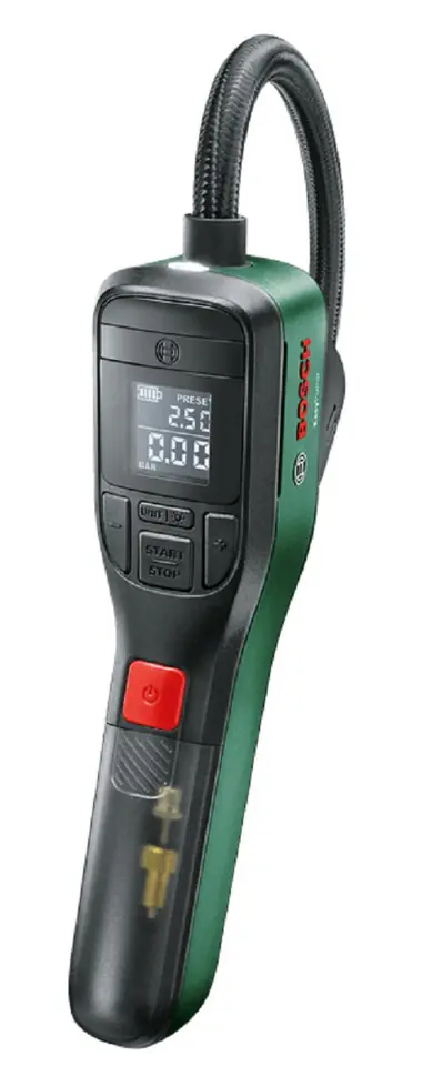 Small tool, high performance: The EasyPump is an intuitive pump from Bosch, designed for all applications and pressures max. 10.3 bar. Real-time pressure measurement and pressure pre-selection function ensure comfort and precision when pumping. The pump has a clear interface and a large display, readable also in daylight. Thanks to its compact and lightweight design, it is ideal for travel. The EasyPump model is equipped with various adapters, located in the glove compartment, and can be used to inflate various types of tires (e.g. car, bicycle), balls (e.g. football), as well as small beach accessories. Pumping is as easy as ever.