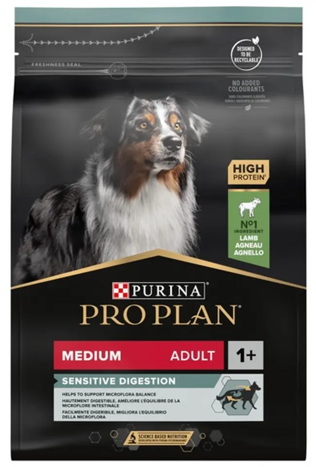 Purina PRO PLAN Medium Adult Sensitive Digestion bogata w jagnięcinę, zawiera formułę Optidigest - zbilansowane źródło składników odżywczych, dobranych specjalnie dla dorosłych psów średniej wielkości z wrażliwym przewodem pokarmowym. Jeśli Twój dorosły pies ma wrażliwy przewód pokarmowy, wypróbuj tej pysznej suchej karmy, by wspierać jego długoletnie zdrowie.